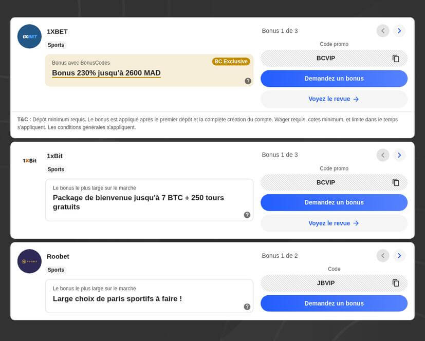 Toutes ces compétitions sont mises en avant sur les sites de nos top bookmakers comme 1XBET, bet365 et Melbet. Ces bookmakers spécialisés dans le foot Maghreb sont parfaits pour vous aider à parier sur ces différentes compétitions en profitant des bonus très compétitifs, comme l'offre exclusive disponible avec code vip 1XBET.